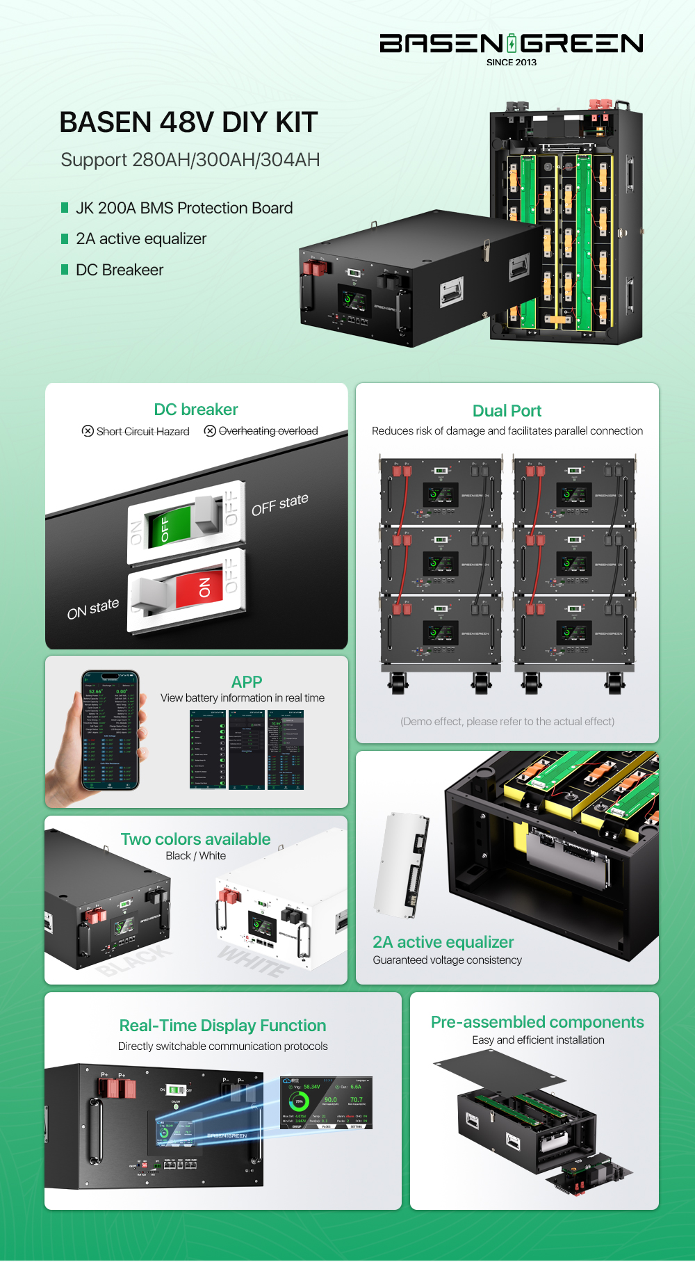 ① BASENGREEN 16S200A smart BMS with BT; ② Active balancer (Optional); ③ DC breaker (Optional); ④ LCD display; ⑤ Shell, Front panel, Cover plate; ⑥ Handle. |